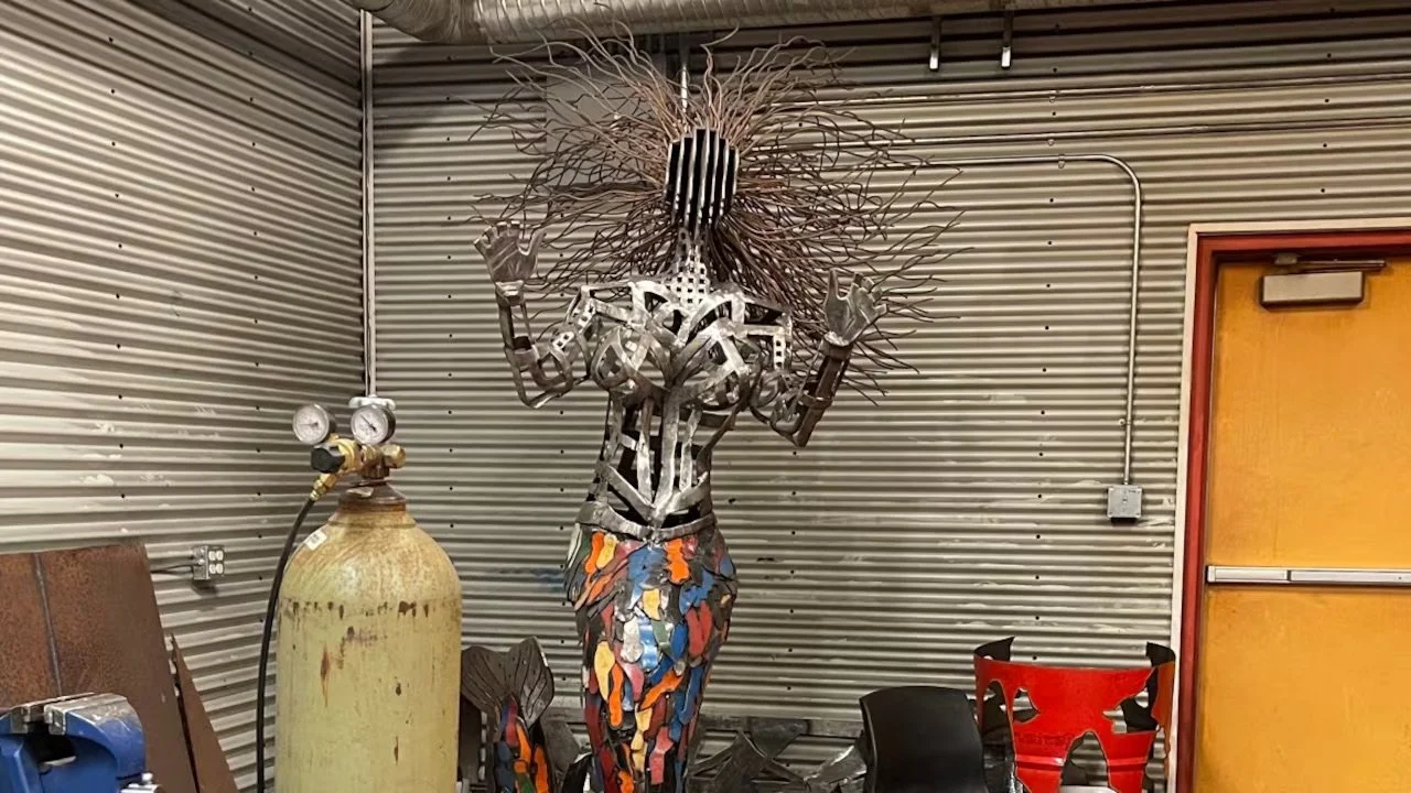 Welders from the Red Fish Arts Studio develop skills by crafting an assortment of metallic animals and other pieces
